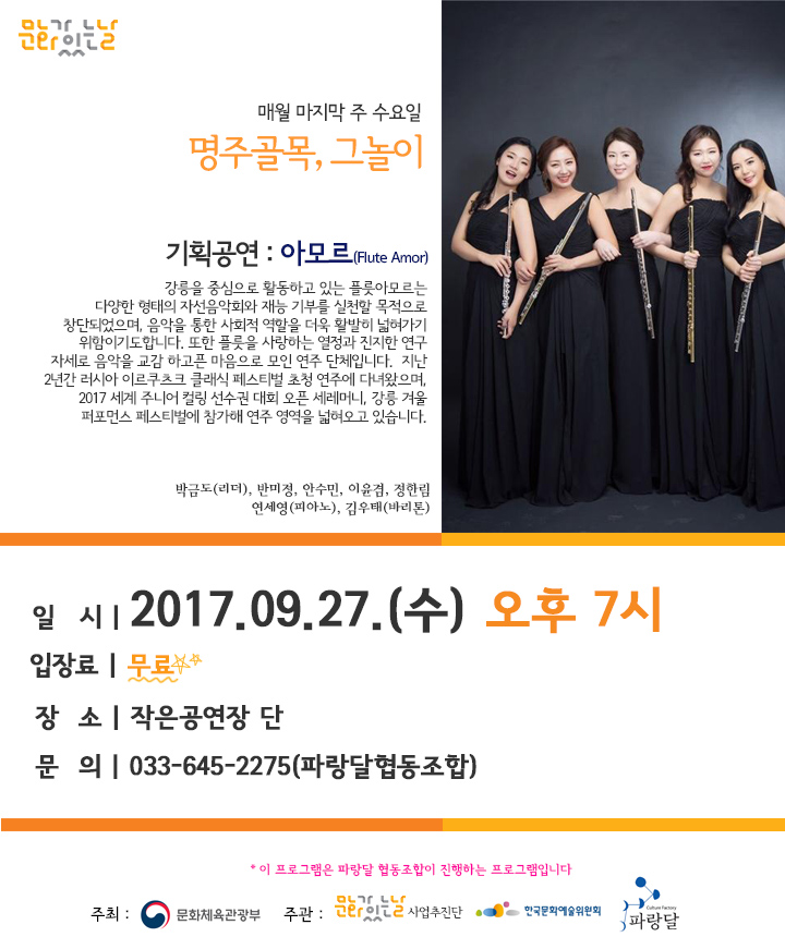 # 9월 문화가 있는날 <기획공연 : 아모르, 플룻공연팀> 페이지 정보 작성자 관리자 (125.♡.50.179) 댓글 0건 조회 8,796회 작성일 17-09-18 15:17 본문 추천0 SNS공유 목록 이전글2017 커피축제 <달그락 쿠킹클래스-사전신청자 명단> 17.10.06 다음글# 9,10월 문화가 있는날 <명주골목, 그 놀이> 17.09.18 댓글목록 댓글목록 등록된 댓글이 없습니다.