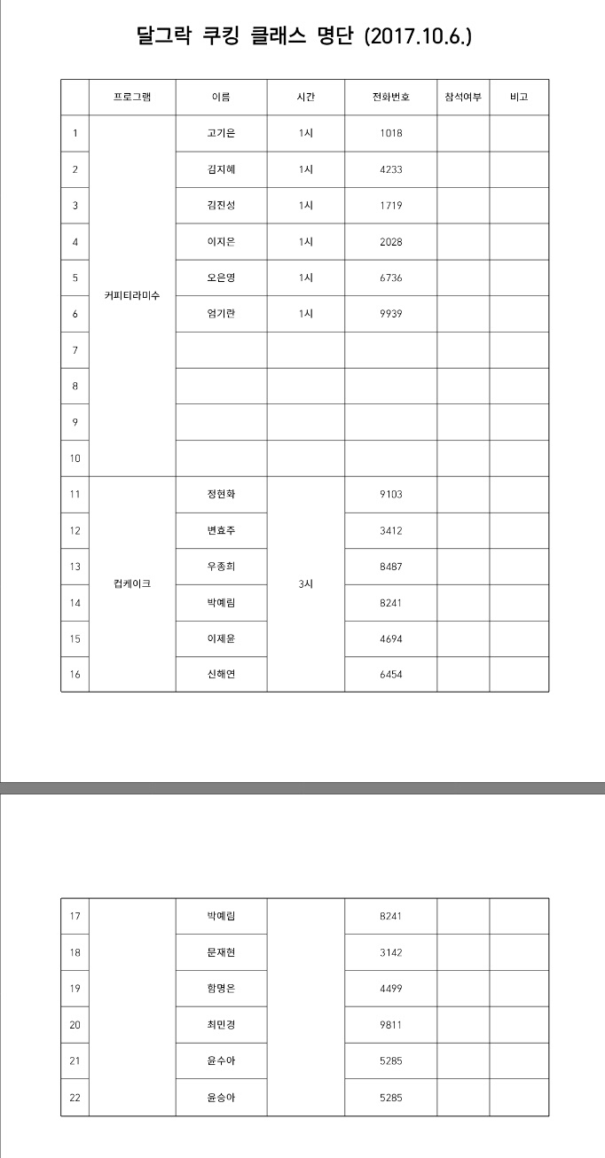2017 강릉커피축제 에 달그락이 진행하는 쿠킹클래스 사전 신청자 명단입니다.